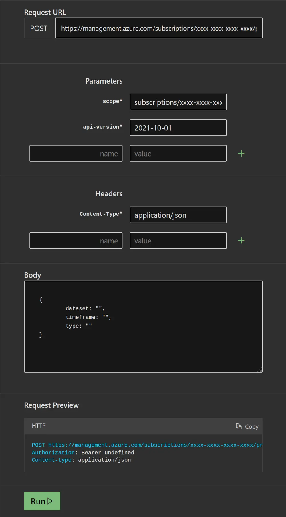 For the parameters only two are required. The scope and the api-version. The api-version is already populated for the latest available version. We want to display a cost report of resources within our subscription so to achieve that we can specify for the scope subscriptions/subscriptionid, which will look something like subscriptions/xxxx-xxxx-xxxx-xxxx.